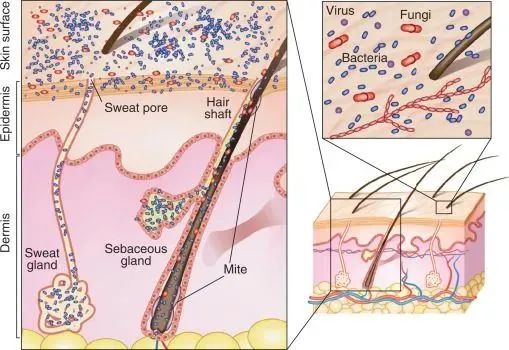 皮膚中存在250種微生物,他們以平均10萬個(gè)/平方厘米的密度分布在我們皮膚的表面。這些細(xì)菌可以被分為兩個(gè)大類:常駐菌群與暫住菌群。常駐菌群是永久定植在皮膚上的,大多人畜無害,擔(dān)任著保護(hù)皮膚不受其他病原體威脅的艱巨任務(wù),這類細(xì)菌的代表:如表皮葡萄球菌,痤瘡丙酸桿菌等。暫住菌群是由和外部的接觸或者皮膚感染的過程中,暫時(shí)降落在皮膚表面的細(xì)菌。由于長駐菌群的存在,這些暫住菌群一般不會(huì)對(duì)人體造成太多的威脅,除非他們直接降落在皮膚損傷的區(qū)域而引發(fā)炎癥和感染。